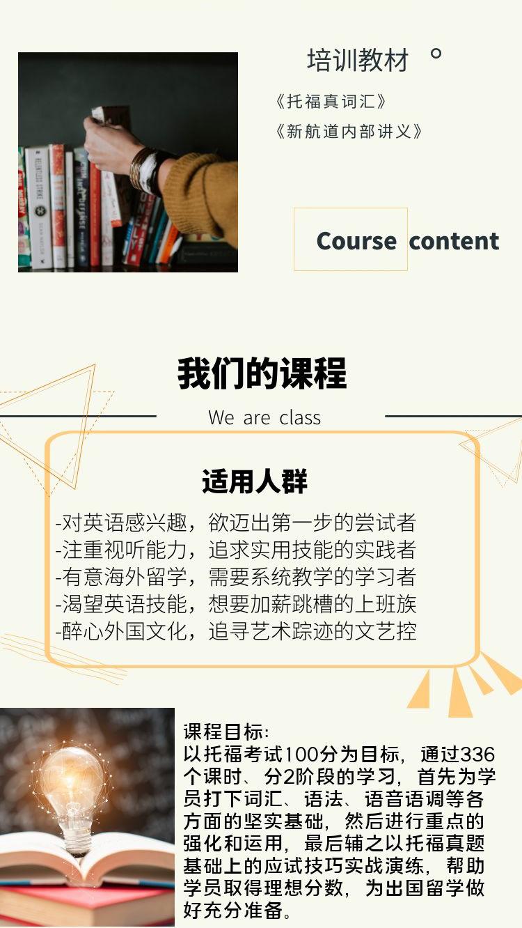 以托福考試100分為目標,通過336個課時、分2階段的學習,首先為學員打下詞匯、語法、語音語調等各方面的堅實基礎,然后進行重點的強化和運用,最后輔之以托福真題基礎上的應試技巧實戰演練,幫助學員取得理想分數,為出國留學做好充分準備。