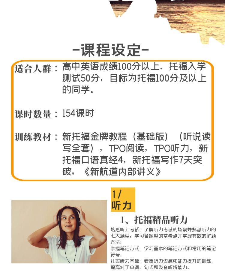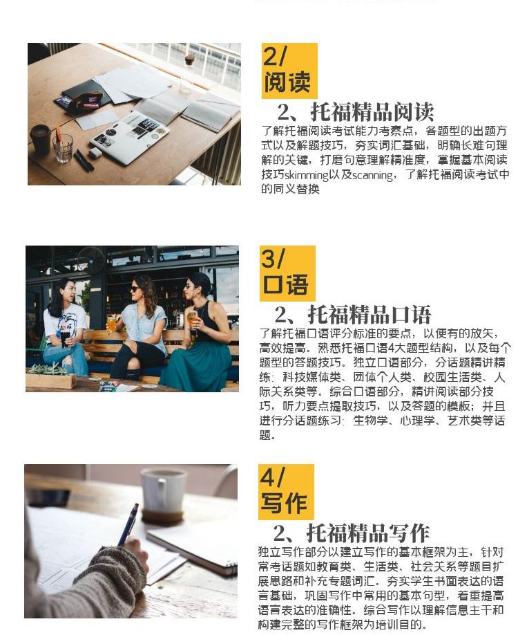 了解托福口語評分標準的要點,以便有的放矢,高效提高。熟悉托福口語4大題型結(jié)構(gòu),以及每個題型的答題技巧。獨立口語部分,分話題精講精練:科技媒體類、團體個人類、校園生活類、人際關(guān)系類等。綜合口語部分,精講閱讀部分技巧,聽力要點提取技巧,以及答題的模板;并且進行分話題練習:生物學、心理學、藝術(shù)類等話題。