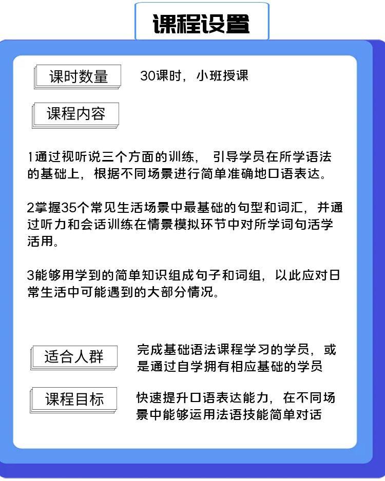 法語培訓(xùn)班-適合學(xué)員:完成基礎(chǔ)語法課程學(xué)習(xí)的學(xué)員,或是通過自學(xué)擁有相應(yīng)基礎(chǔ)的學(xué)員
