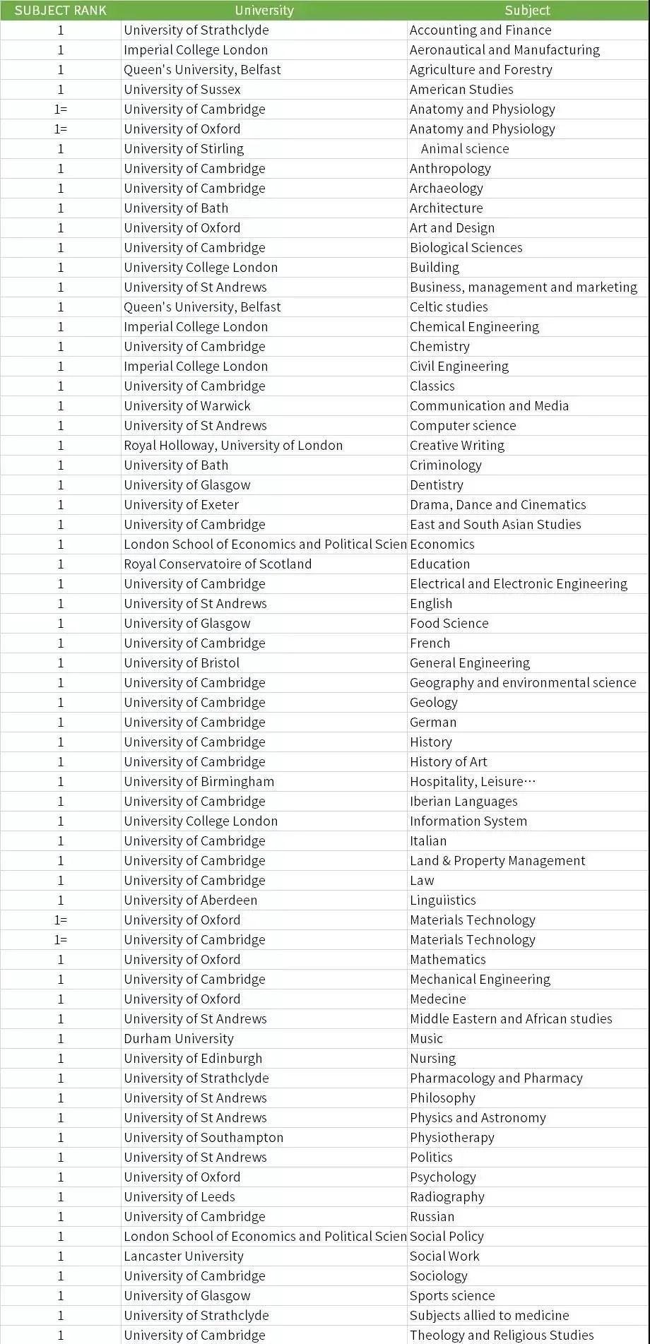 2022 TIMES英國大學排名熱門專業排名