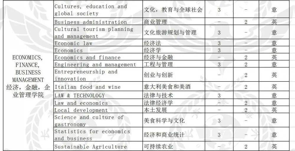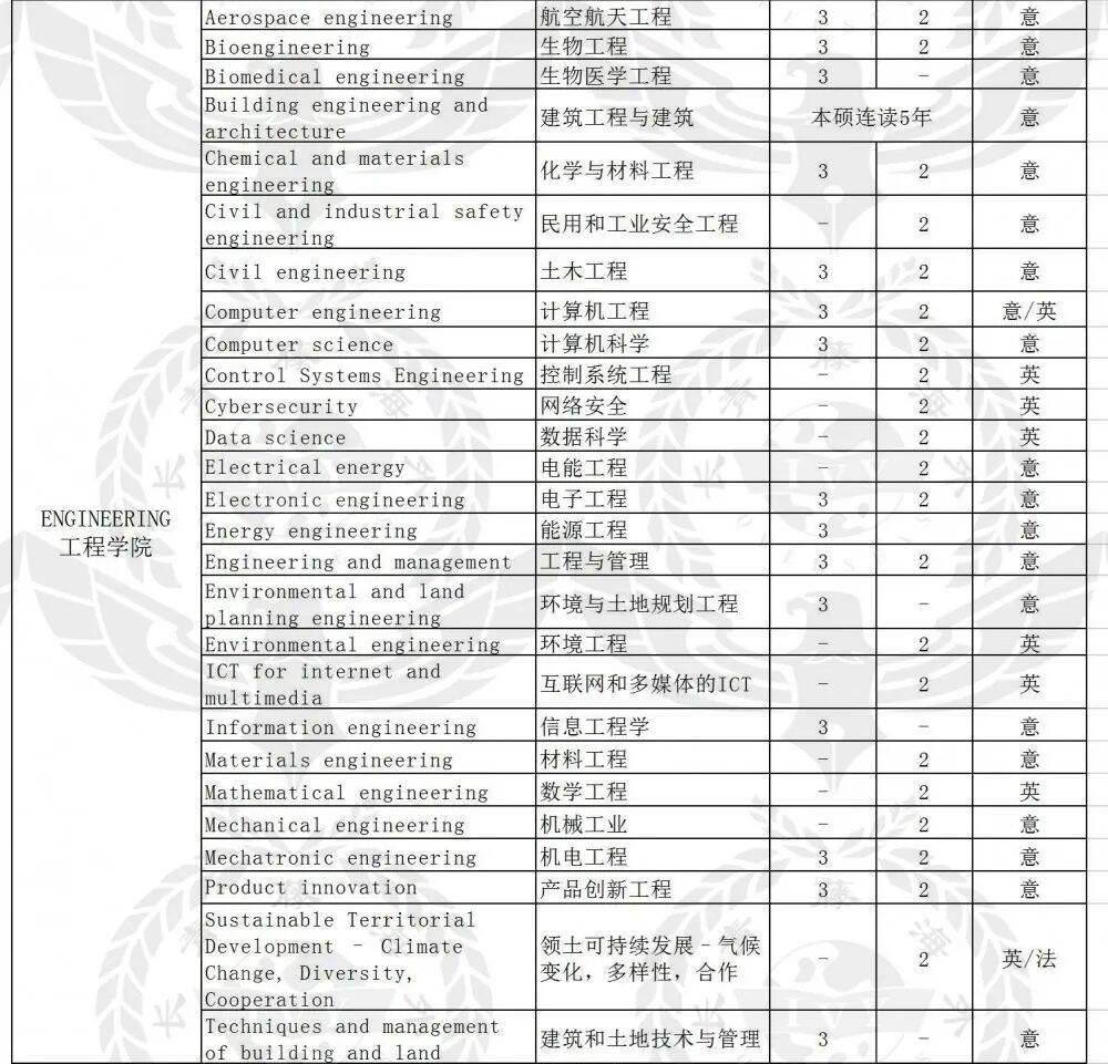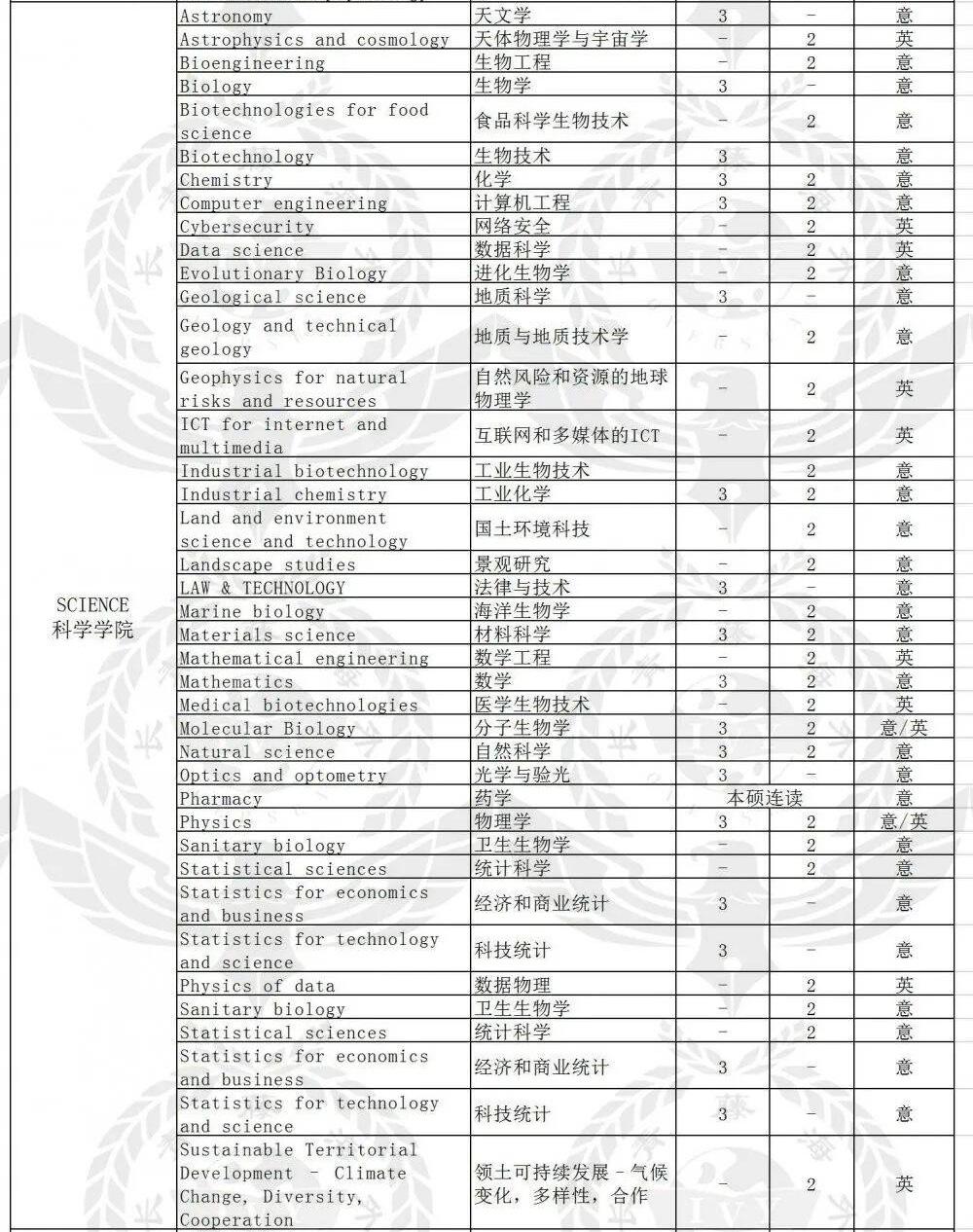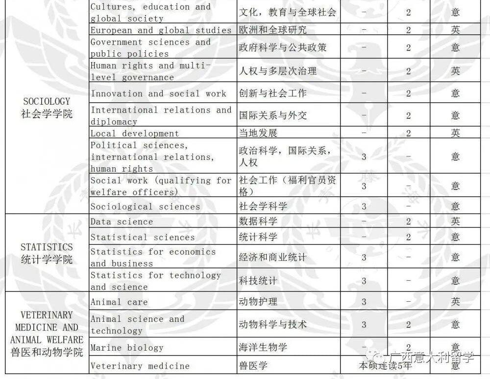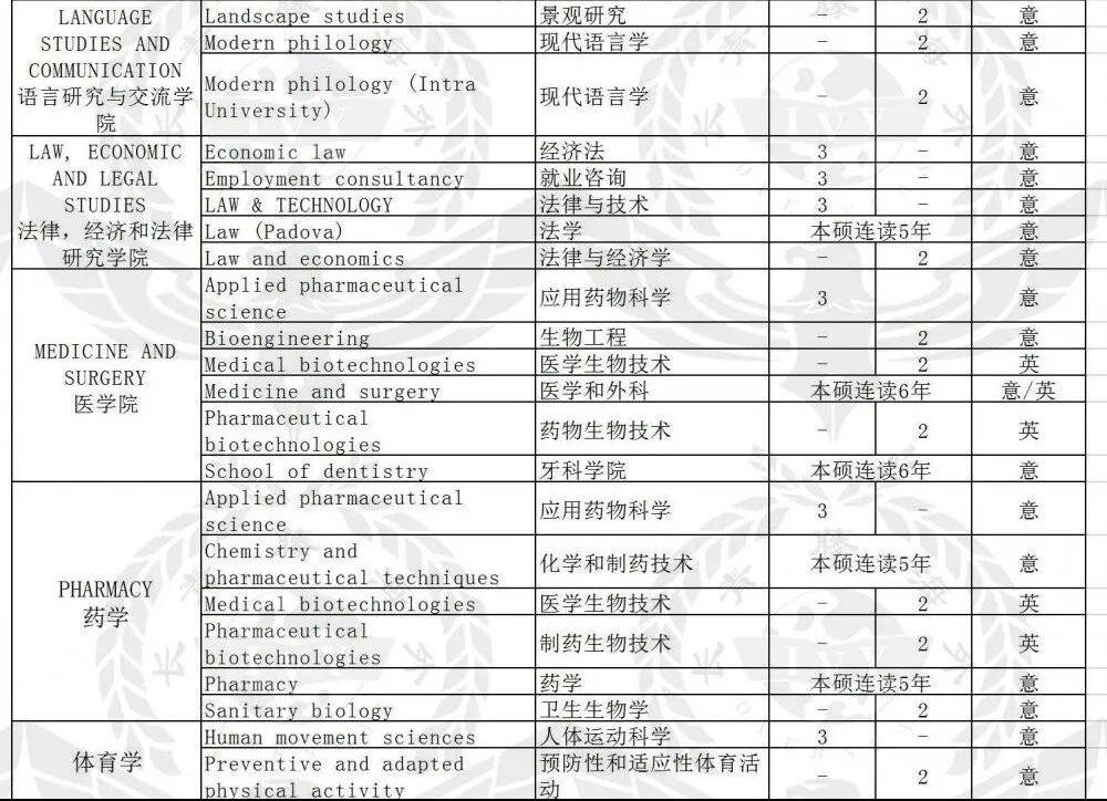 法學(xué)碩士、考古科學(xué)、進(jìn)化生物學(xué)、海洋生物學(xué)、健康生物學(xué)、工業(yè)生物技術(shù)、食品生物技術(shù)、醫(yī)學(xué)生物技術(shù)、制藥生物技術(shù)-制藥生物技術(shù)、藥物化學(xué)與技術(shù)、制藥和工業(yè)制藥、現(xiàn)代語言學(xué)、經(jīng)典字母和古代歷史、電腦技術(shù)、航空工程、生物工程、化學(xué)和工業(yè)過程工程、土木工程、自動化工程、機(jī)電工程、民用和工業(yè)安全工程、互聯(lián)網(wǎng)和多媒體的ICT-多媒體和互聯(lián)網(wǎng)通信的工程、電能工程、電子工程、能源與核工程、管理工程、計算機(jī)工程、產(chǎn)品創(chuàng)新工程、機(jī)械工業(yè)、語言學(xué)、數(shù)學(xué)、醫(yī)學(xué)與外科、醫(yī)學(xué)與外科、老兵專用醫(yī)藥、牙科和假牙、神經(jīng)科學(xué)與神經(jīng)心理康復(fù)、臨床發(fā)展心理學(xué)、臨床心理學(xué)、臨床動力心理學(xué)、應(yīng)用認(rèn)知心理學(xué)、發(fā)展與教育心理學(xué)、社區(qū)心理,促進(jìn)福祉和社會變革、社會,工作和溝通心理學(xué)、國際關(guān)系與外交、材料工程、材料科學(xué)、化學(xué)、自然科學(xué)、政府科學(xué)與公共政策、宗教科學(xué)、進(jìn)行科學(xué)和多媒體制作、預(yù)防和適應(yīng)運(yùn)動活動的科學(xué)和技術(shù)、農(nóng)業(yè)科學(xué)與技術(shù)、可持續(xù)農(nóng)業(yè)-可持續(xù)農(nóng)業(yè)、意大利美食與美酒-意大利美食與美酒、食品科學(xué)與技術(shù)、工業(yè)化學(xué)、森林科學(xué)、森林與環(huán)境科學(xué)、地質(zhì)技術(shù)地質(zhì)、環(huán)境與領(lǐng)土科學(xué)技術(shù)、經(jīng)濟(jì)與法律、哲學(xué)科學(xué)、統(tǒng)計科學(xué)、歷史科學(xué)、文化,培訓(xùn)與全球社會、動物科學(xué)與技術(shù)、創(chuàng)新與社會服務(wù)、藝術(shù)史、溝通策略、衛(wèi)生專業(yè)科學(xué),診斷技術(shù)、衛(wèi)生保健專業(yè)、建筑工程建筑。